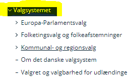 siderne under de 3 punkter: "Europa-Parlamentsvalg", "Folketingsvalg og folkeafstemninger" og "Kommunal- og regionalvalg"