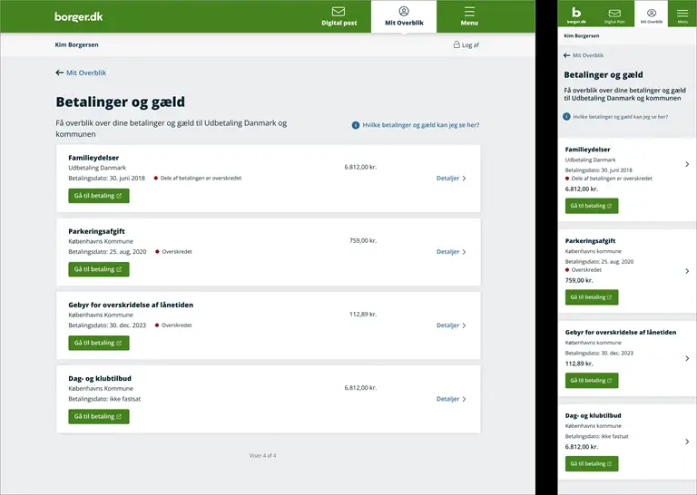 På Mit Overblik på borger.dk har der fra forsiden hidtil været 2 separate indgange til henholdsvis ’Betalinger’ og ’Gæld’. De to bliver nu slået sammen til den nye indgang ’Betalinger og gæld’. Det sker samtidig med, at Udbetaling Danmark overgår til at udstille gæld på samme måde som kommunerne, så borgerne nu kan se gæld fra både Udbetaling Danmark og kommunerne på én og samme liste.
