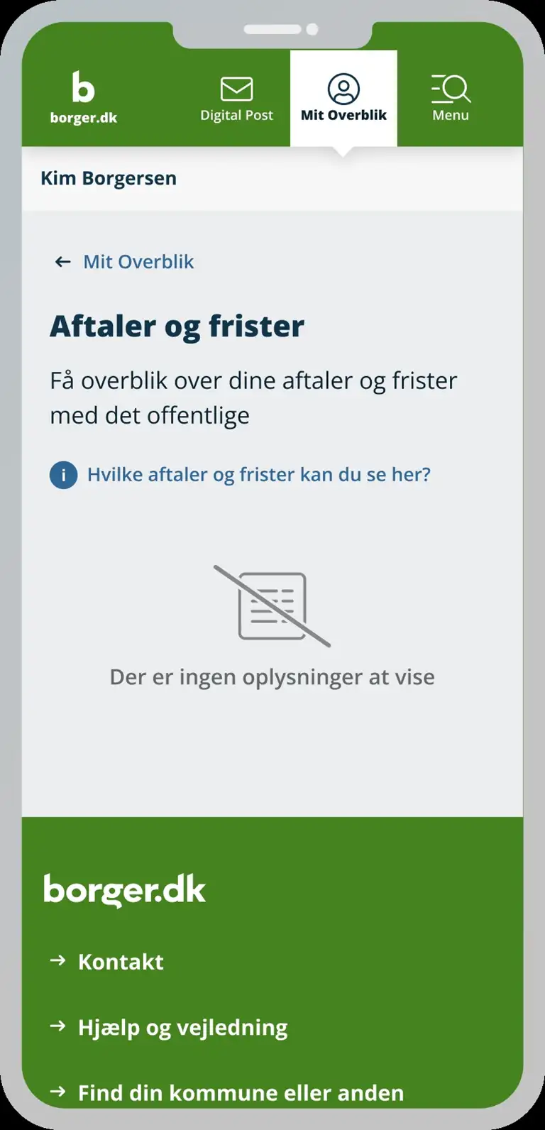 I samarbejde med KL, STAR og KOMBIT viser kommunerne beskæftigelsesaftaler og frister på Mit Overblik under ’Aftaler og frister’. Målgruppen er borgere uden job, som har et forløb i deres jobcenter. Hidtil har borgerne kun kunnet se disse oplysninger på jobnet.dk, og nu kan de også få et overblik over de aktuelle og kommende aftaler og frister, de har med jobcenteret på Mit Overblik. Borgeren får fx en påmindelse om at booke en obligatorisk samtale med sit jobcenter og kan efterfølgende se aftalen med dato, tid og mødested. Mit Overblik vil løbende blive udbygget med flere aftaler og frister med det offentlige.