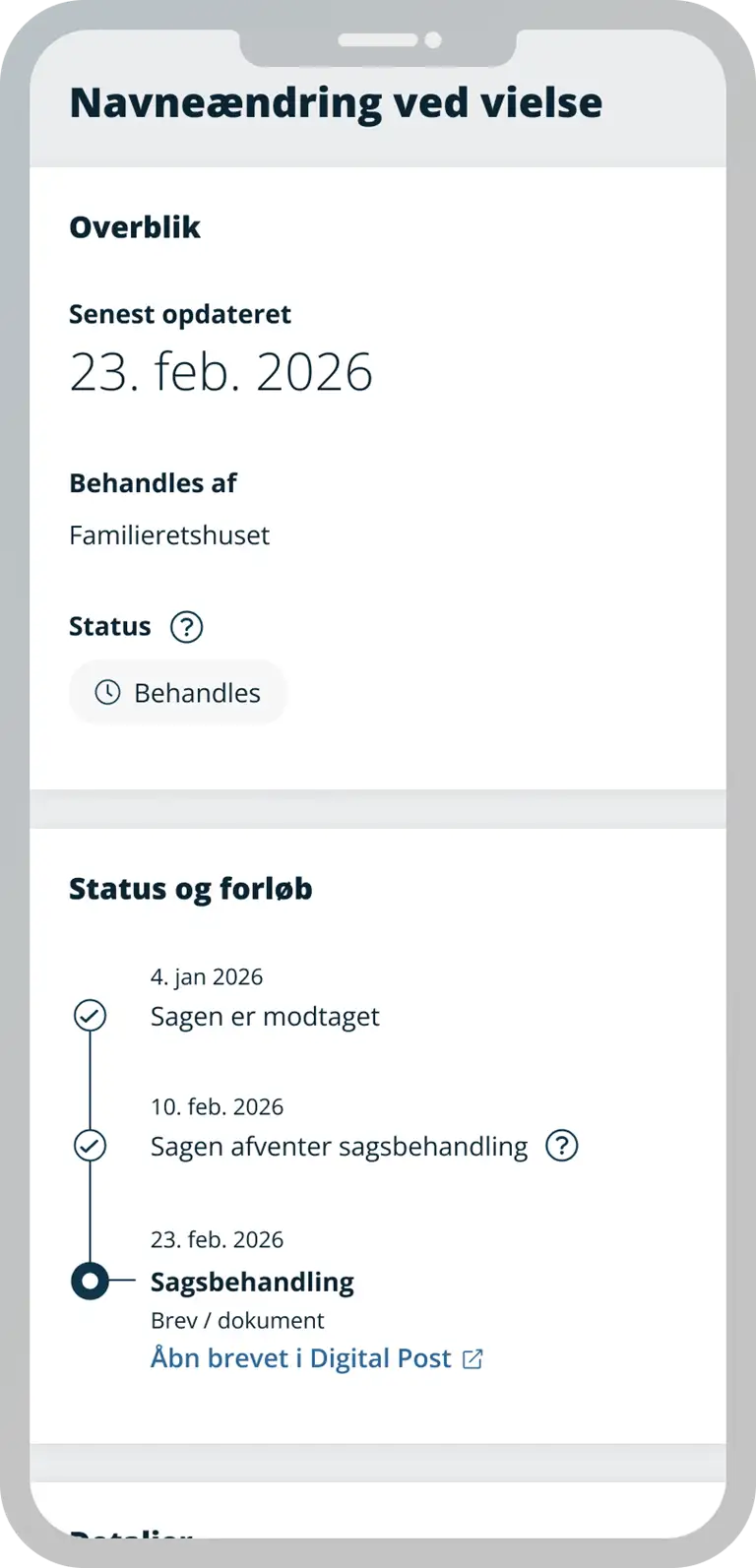 Borgere kan nu følge med i en række sagstyper på Mit Overblik, som Familieretshuset behandler på navneområdet. Det gælder sager om:
