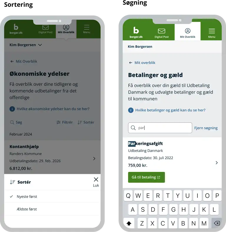 I forbindelse med release 35 blev der udviklet en søgnings-, filtrerings- og sorteringsfunktion til Mit Overblik for at hjælpe brugerne med at søge, filtrere og sortere i lange lister. I første omgang blev funktionaliteten implementeret på de indholdsområder på Mit Overblik, hvor behovet var størst: ’Beviser’, ’Aftaler og frister’ og ’Serviceydelser og hjælpemidler’. Nu tilføjes funktionaliteten til de resterende indholdsområder: ’Sager’, ’Økonomiske ydelser’ og ’Betalinger og gæld’. Dermed får borgerne også her bedre mulighed for hurtigt og nemt at finde det relevante – enten ved at søge på noget konkret eller ved at frafiltrere det uvæsentlige. Det gør det lettere at bevare overblikket i situationer, hvor borgeren får vist meget indhold.