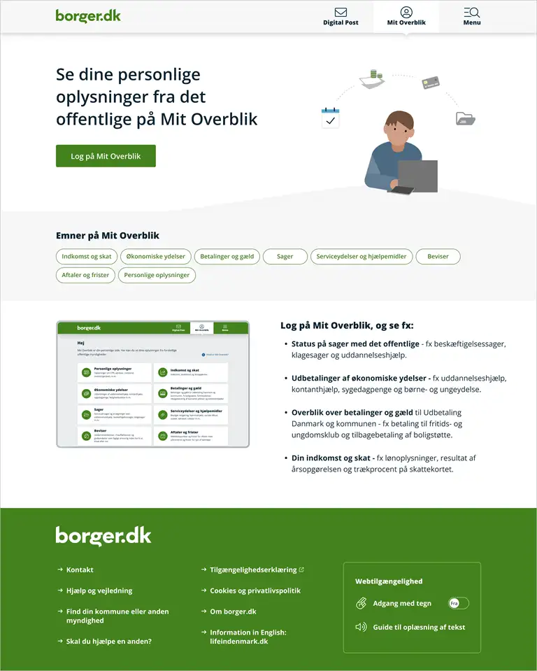 I dag logger borgerne direkte ind på Mit Overblik fra forsiden af borger.dk. Det direkte login giver ikke borgerne en klar fornemmelse af, hvilken løsning de logger ind på. Derfor er der udviklet en ny landingsside uden login til Mit Overblik, som skal formidle og skabe klare forventninger til, hvad Mit Overblik er, før login. Den åbne landingsside er søgemaskineoptimeret og skal også bruges i indsatsen for at udbrede kendskabet til Mit Overblik. Landingssidens indhold minder konceptmæssigt om det flow, brugerne kender fra login på andre portaler, fx ’Min Side’ på sundhed.dk.