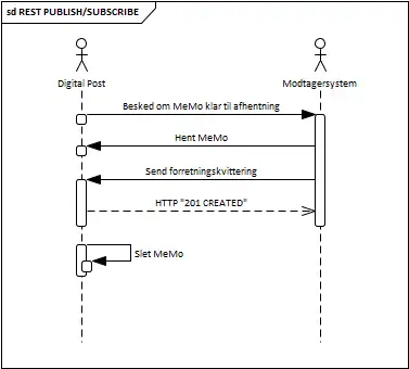 REST PUBLISH/SUBSCRIBE Snitfladen minder om ovenstående PULL snitflade, med den forskel, at løsningen giver besked om tilgængelige meddelelser. Dermed skal modtagersystemet ikke selv løbende tjekke om der er nye tilgængelige meddelelser, men skal stadig selv afhente dem. Løsningen giver besked til modtagersystemet for hver meddelelse, når denne er klar til afhentning. Herefter kan modtagersystemet selv hente tilgængelige meddelelser fra løsningen. Løsningen afventer gyldig forretningskvittering fra modtagersystem og herefter slettes meddelelse i løsningen og vil derfor ikke kunne hentes igen.