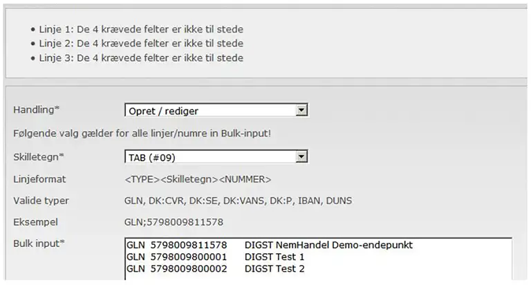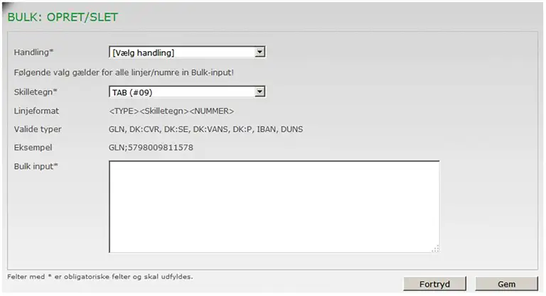 Efter klik på ”Gem” kvitteres der kort med meddelelsen ”Bulk-input handlingen er gennemført”.