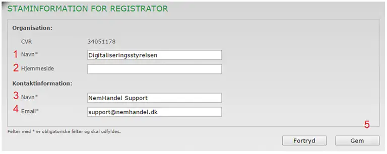 Indtast oplysninger vedrørende registratoren (den virksomhed/organisation, som du som medarbejder arbejder for).