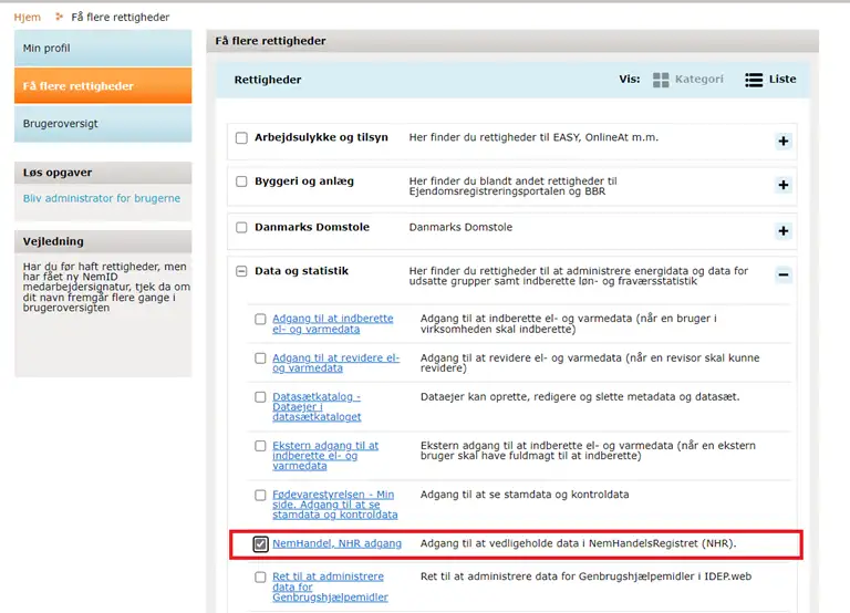 Virksomhedens MitID-administrator skal gå til https://brugeradministration.nemlog-in.dk. Her skal de udvalgte medarbejdere have tildelt rettigheden ”Nemhandel, NHR adgang” (findes under Data og statistik):